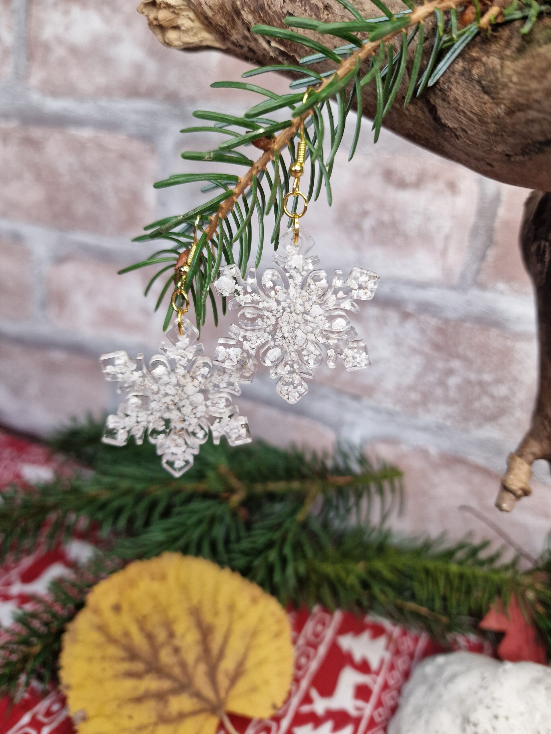 Ces boucles d’oreilles artisanales en forme de flocons mêlent liège recyclé et éclats dorés et blancs coulés dans une résine transparente.
