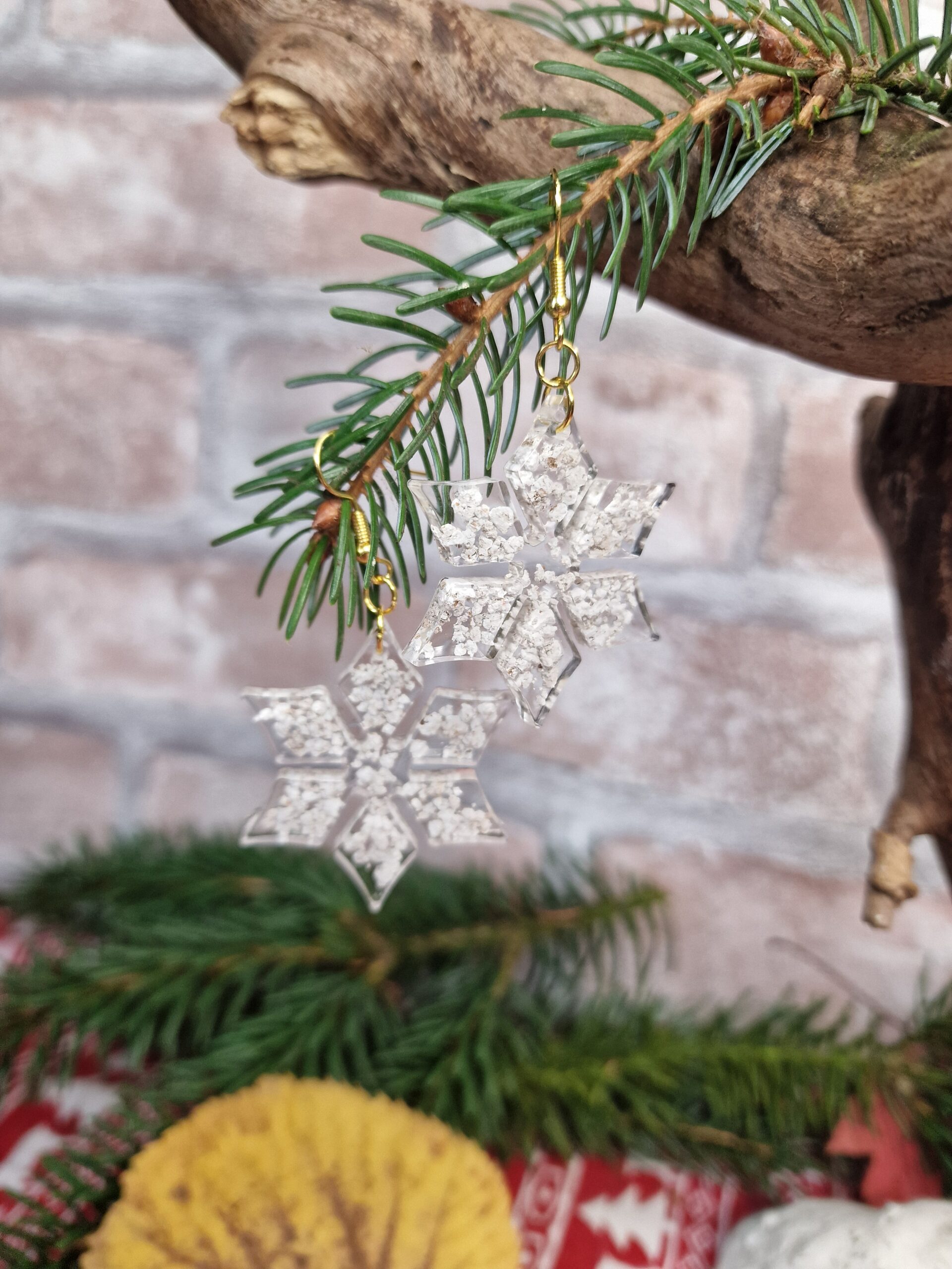 Ces boucles d’oreilles artisanales en forme de flocons mêlent liège recyclé et éclats dorés et blancs coulés dans une résine transparente.