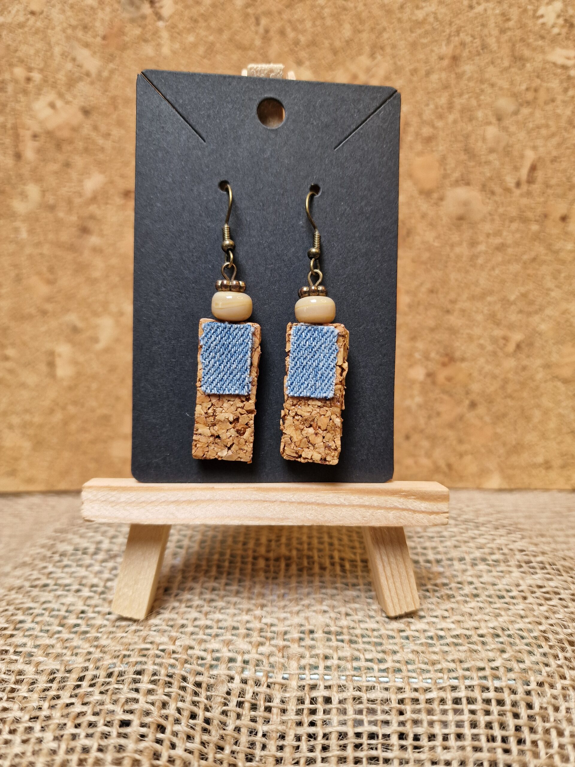Ces boucles d’oreilles artisanales signées Cé’rénité associent la douceur du liège naturel à la texture du denim bleu récupéré. Leur design rectangulaire est rehaussé d’une perle bois clair, pour un contraste à la fois naturel et moderne.