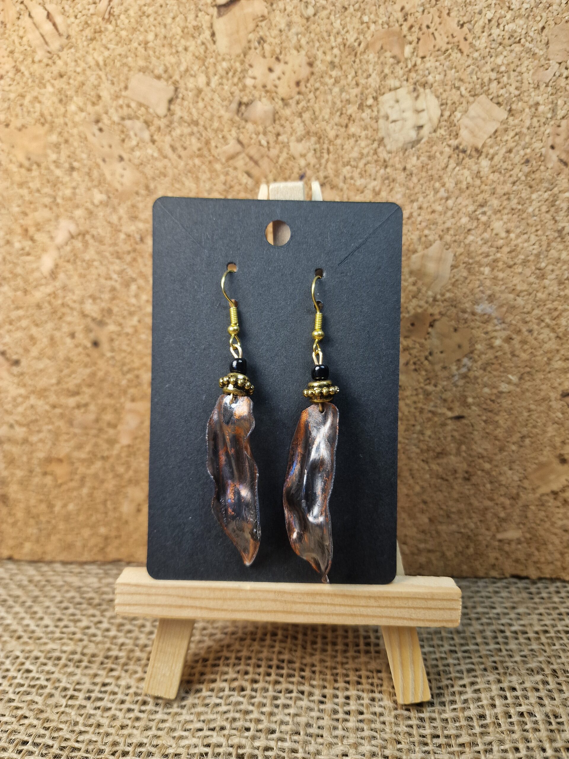 Ces boucles d’oreilles artisanales signées Cé’rénité associent la chaleur du cuivre à la profondeur du noir. Réalisées à la main à partir de plastique recyclé et agrémentées de perles de récupération, elles captent la lumière avec des reflets changeants pour un rendu à la fois élégant et poétique.