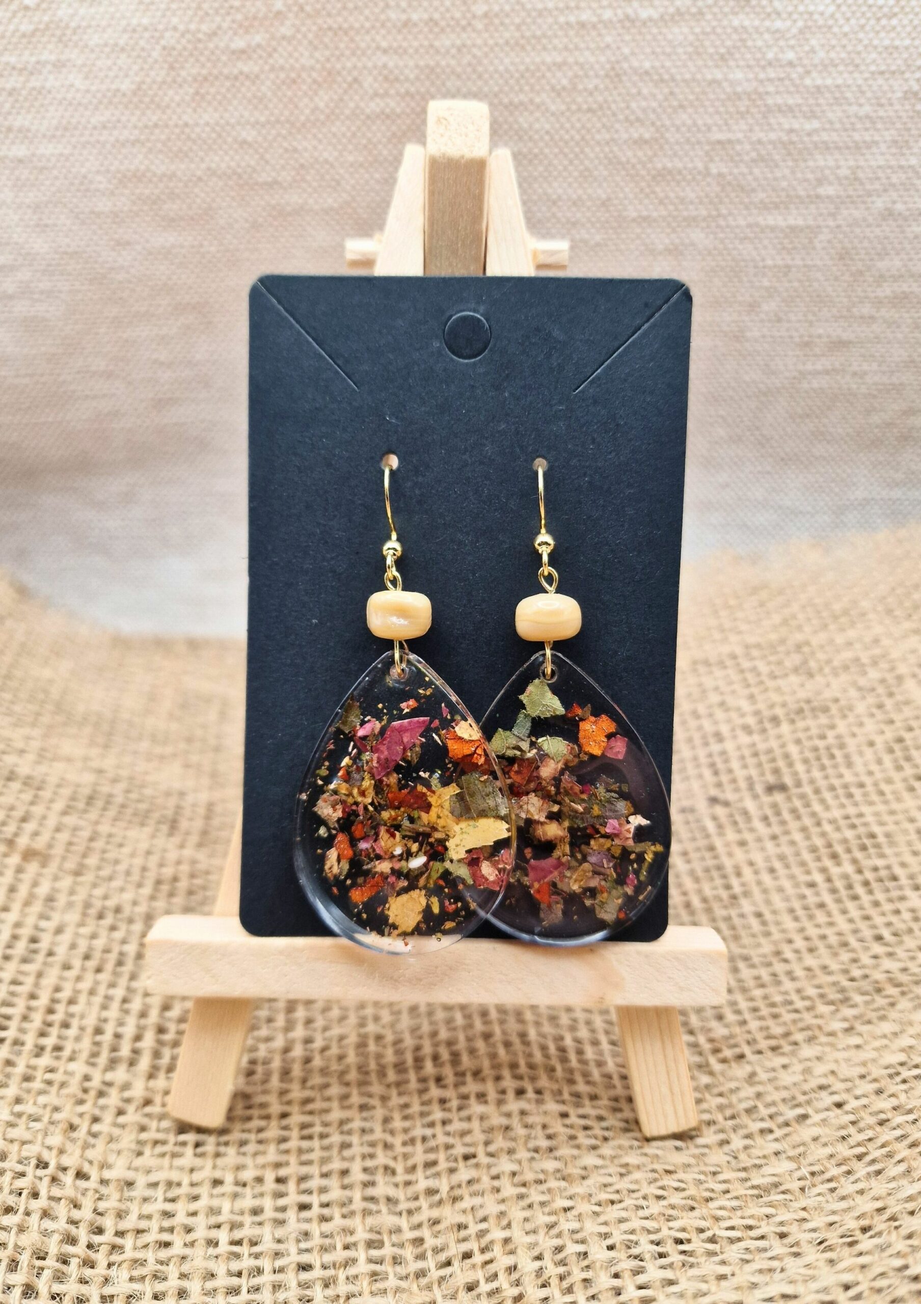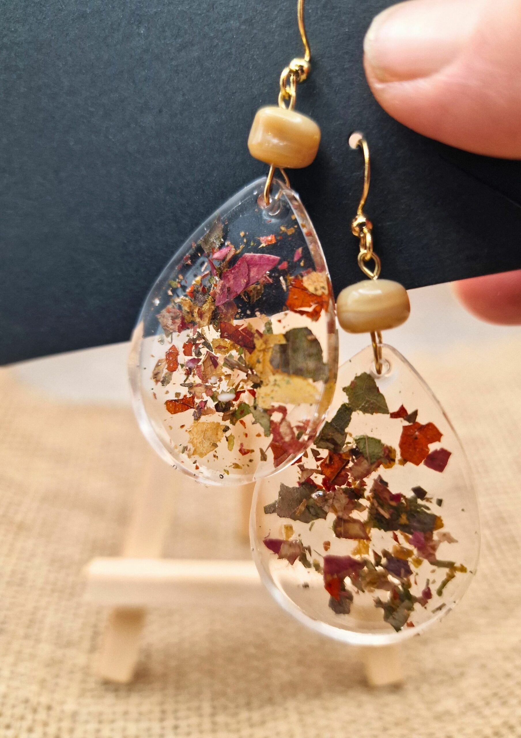 Ces boucles d’oreilles artisanales signées Cé’rénité capturent la beauté d’une feuille naturelle, emprisonnée dans la résine.