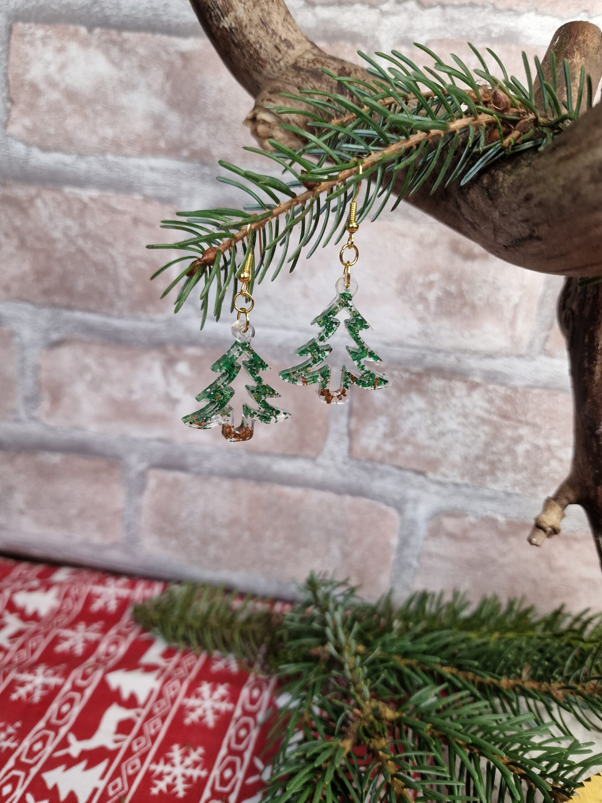Ces boucles d’oreilles artisanales en forme de sapin sont réalisées à partir de liège recyclé et de résine verte teintée de brun.