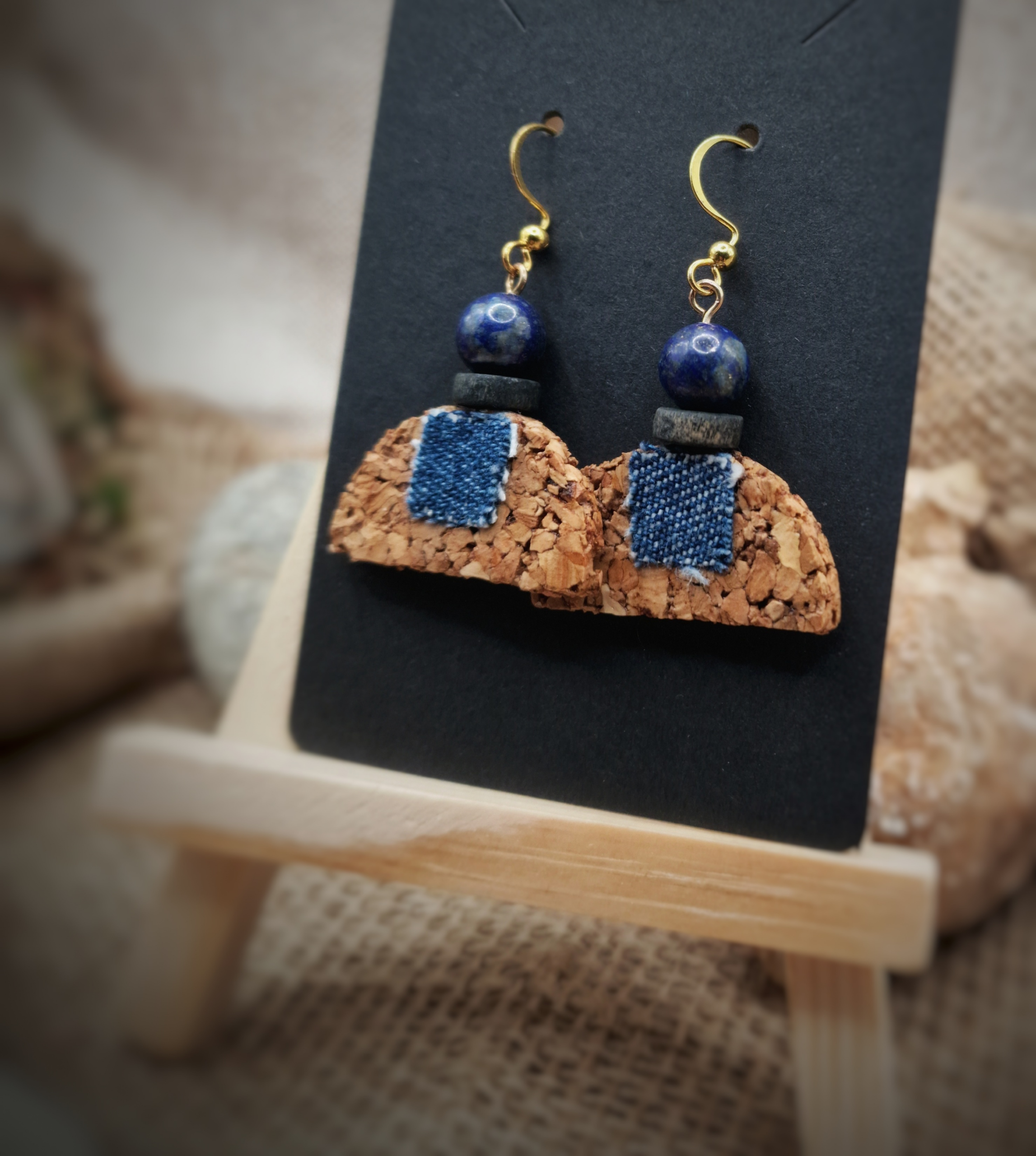 Ces boucles d’oreilles artisanales signées Cé’rénité sont réalisées à partir de liège naturel associé à du jean recyclé, revalorisé dans une démarche de seconde vie.