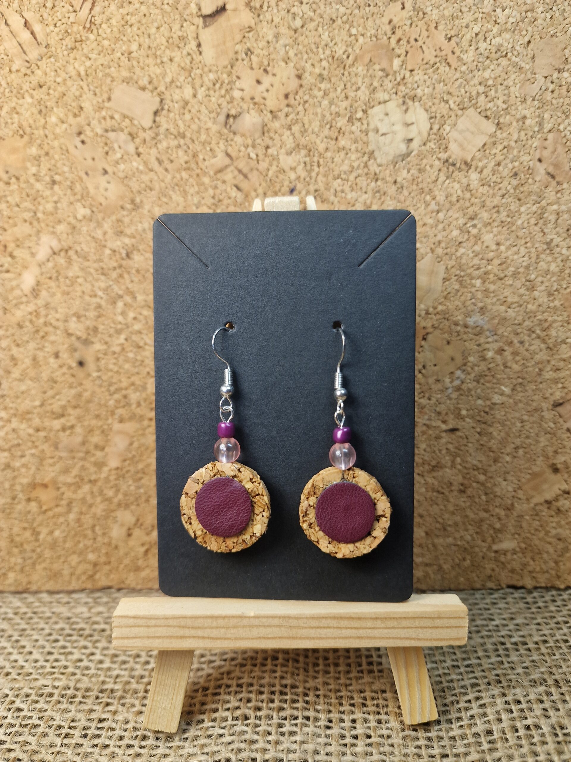 Matières : liège naturel, cuir bordeaux mauve, perles de récupération