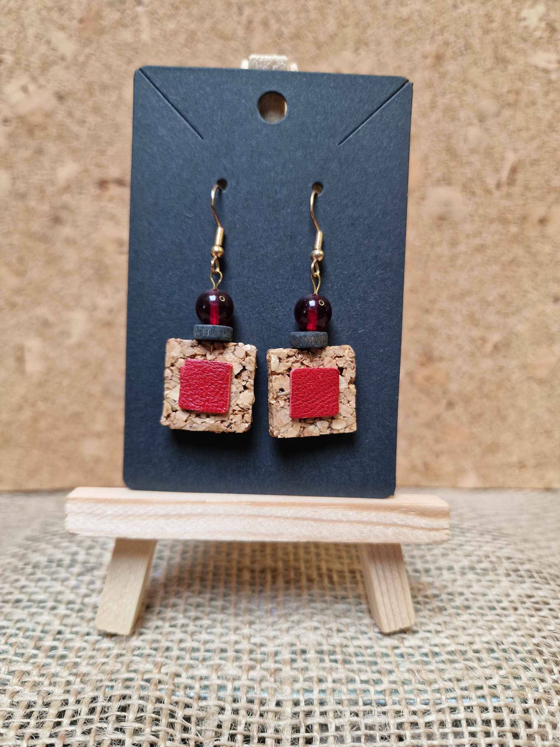 Boucles d’oreilles liège & cuir rouge (doré – 5 cm)