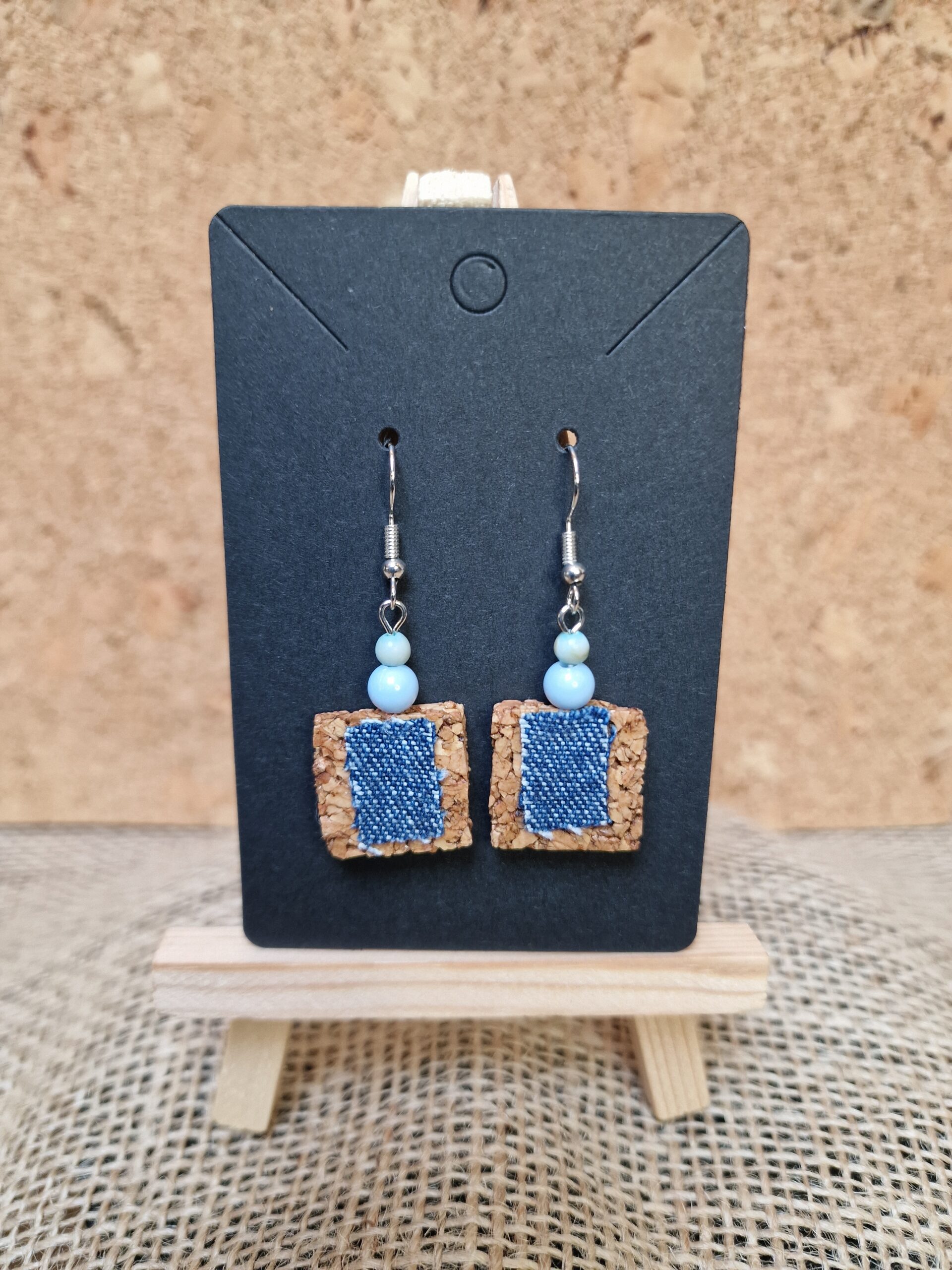 Boucles d’oreilles liège & jean bleu (argenté – 5 cm)