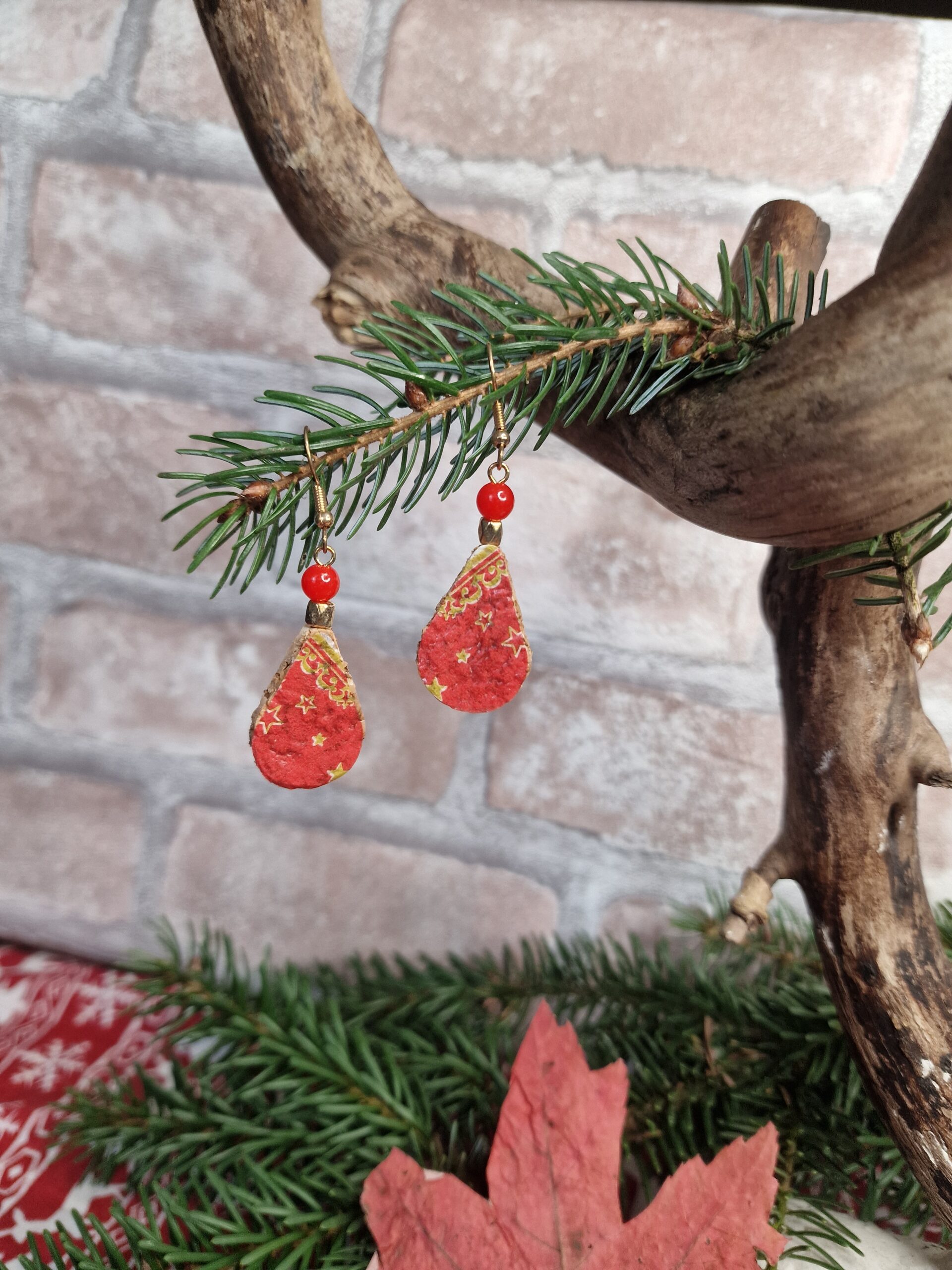 Ces boucles d’oreilles artisanales signées Cé’rénité sont réalisées en liège décoré à la serviette rouge ornée d’étoiles dorées.