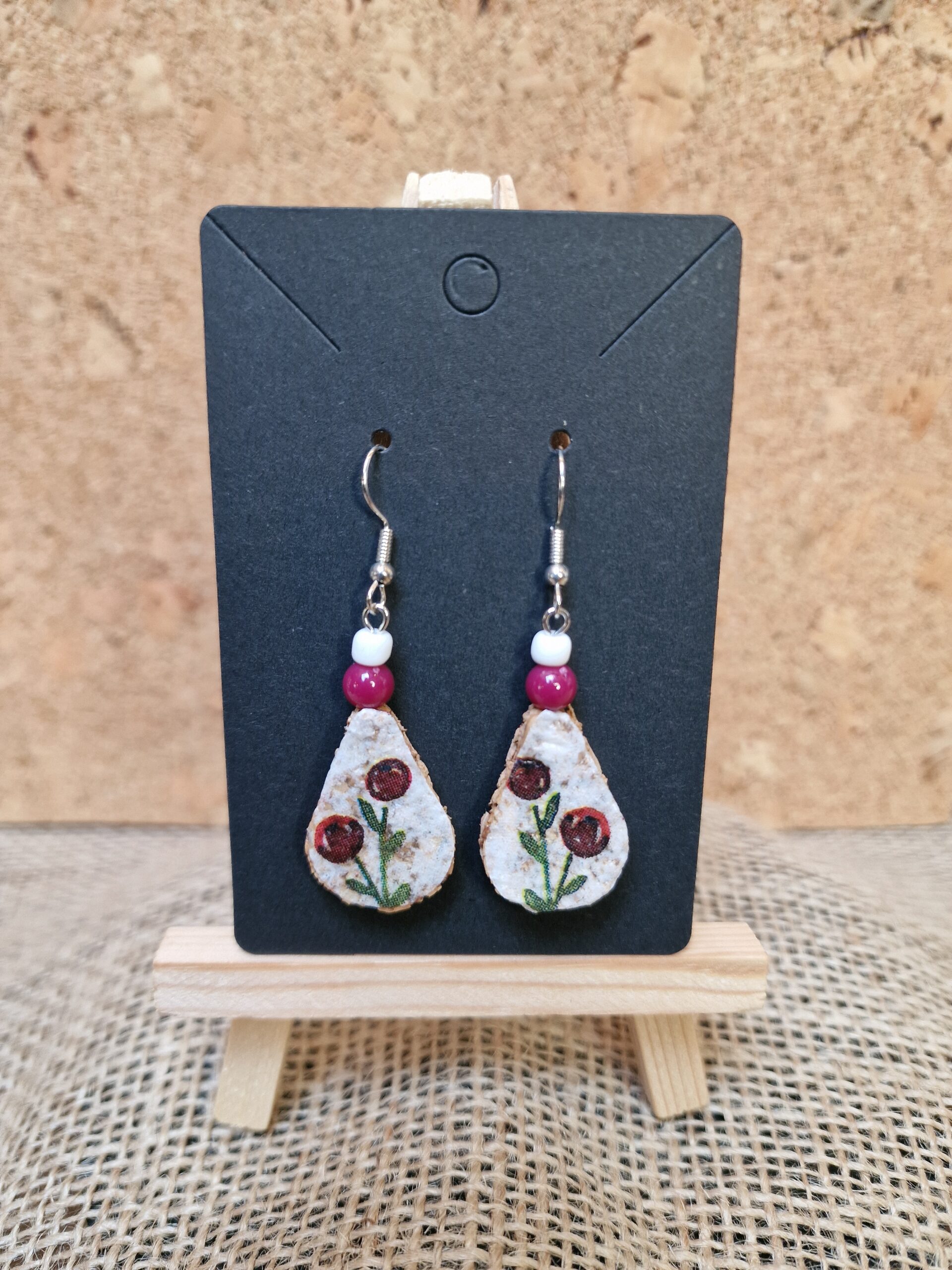 Ces boucles d’oreilles artisanales signées Cé’rénité allient légèreté, originalité et respect de l’environnement. Réalisées à partir de liège recyclé, elles sont décorées à la main selon la technique du serviettage, avec un motif rouge fleuri issu de serviettes récupérées.