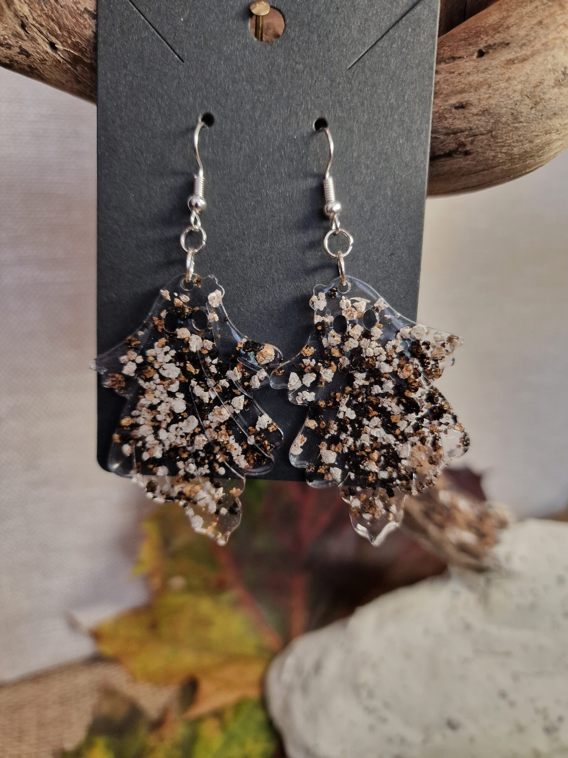 Ces boucles d’oreilles signées Cé’rénité revisitent le thème d’Halloween avec élégance et légèreté. Réalisées en résine transparente avec des inclusions de liège naturel et des éclats noirs, elles jouent sur les contrastes pour un effet à la fois raffiné et original.