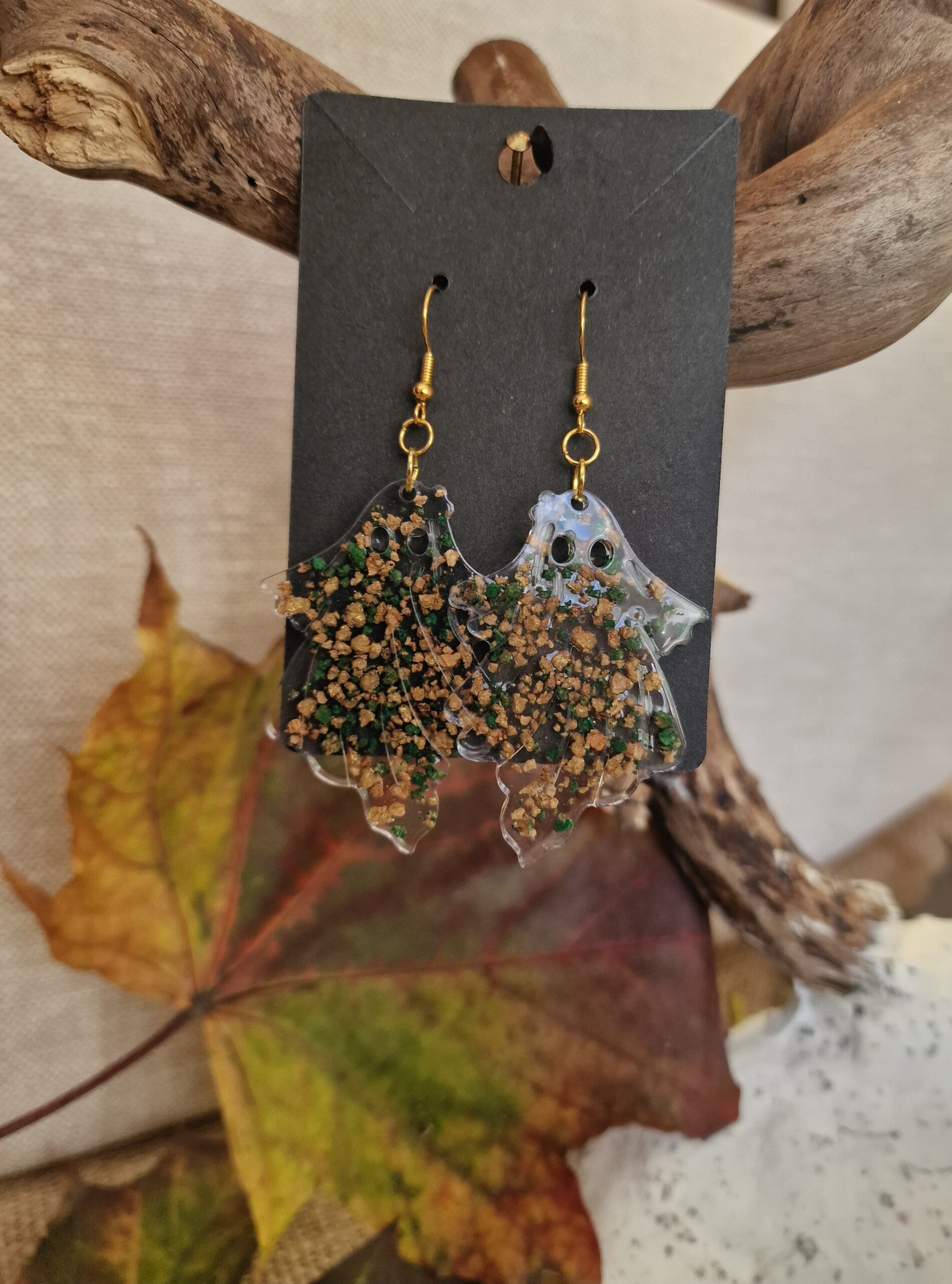 Ces boucles d’oreilles artisanales signées Cé’rénité mêlent nature et fantaisie avec un clin d’œil à la saison automnale. Réalisées en résine transparente avec des inclusions de liège naturel et d’éclats verts, elles évoquent les nuances de la forêt pour un style à la fois ludique et raffiné.