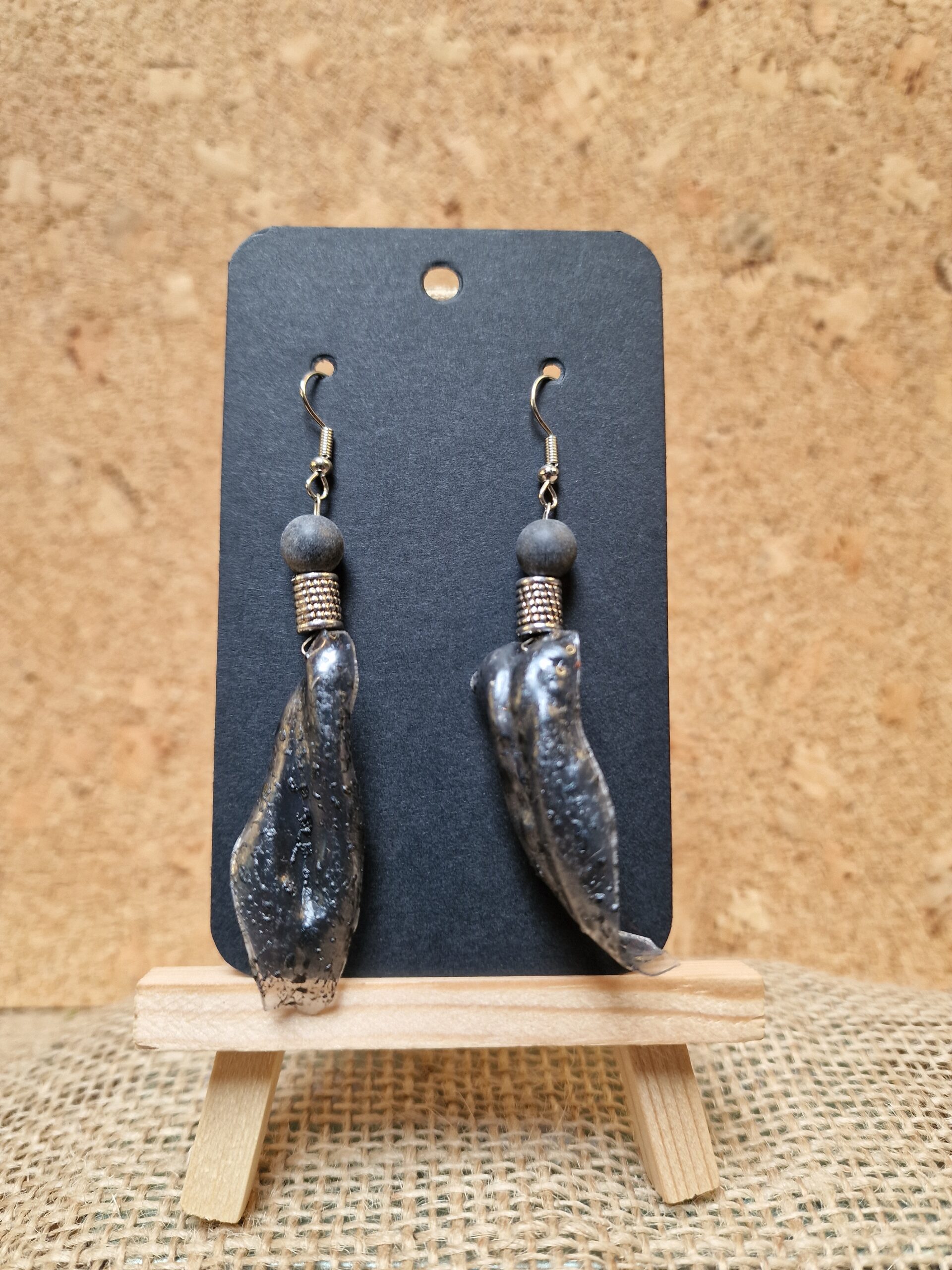 Boucles d’oreilles plastique recyclé noir & gris moucheté (argenté – 8 cm)