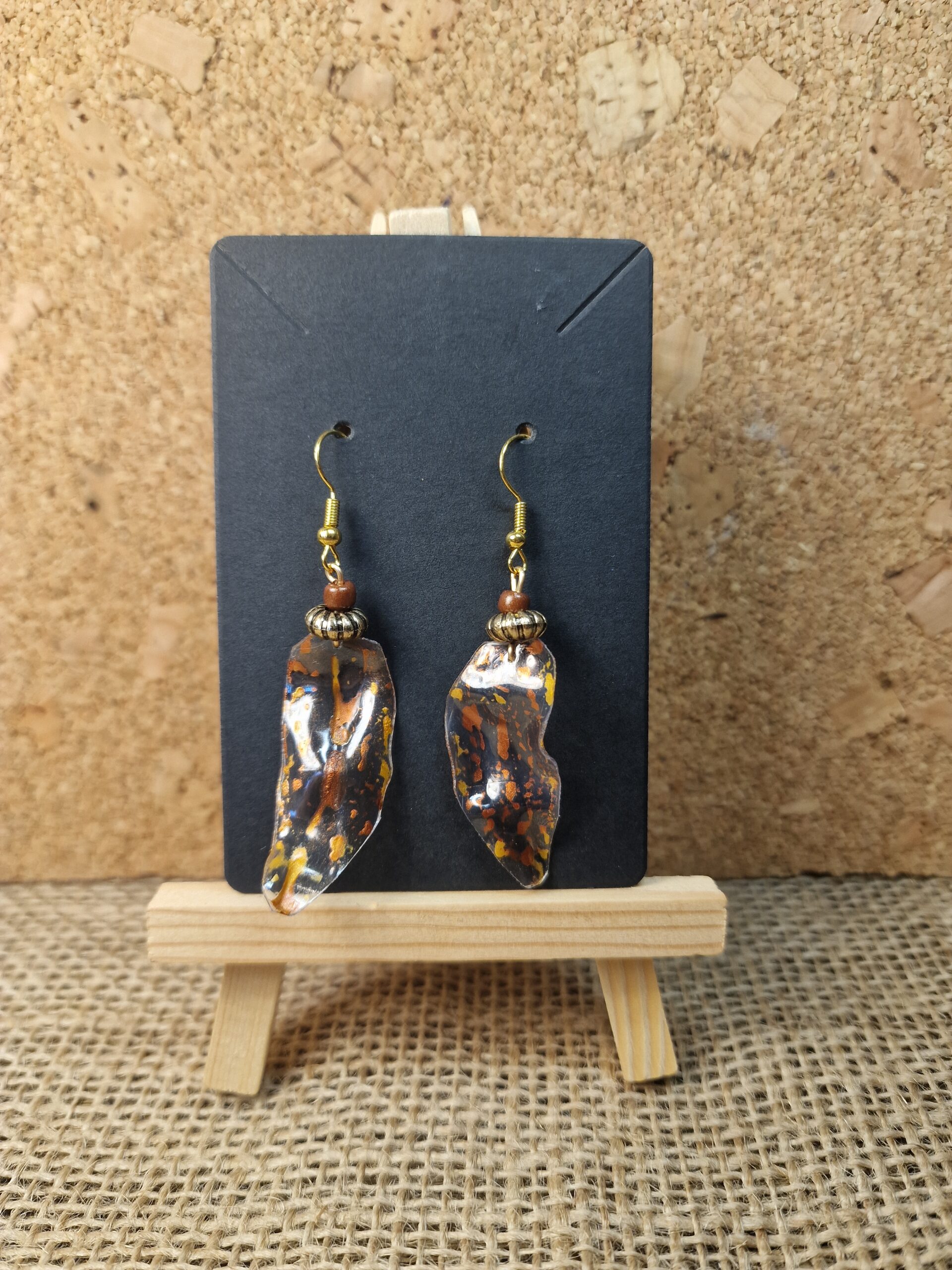Ces boucles d’oreilles artisanales signées Cé’rénité incarnent l’énergie et la créativité de la marque. Réalisées à la main à partir de plastique recyclé peint en nuances d’orange, de cuivre et de doré, elles sont rehaussées de perles de récupération pour un éclat chaleureux et lumineux.