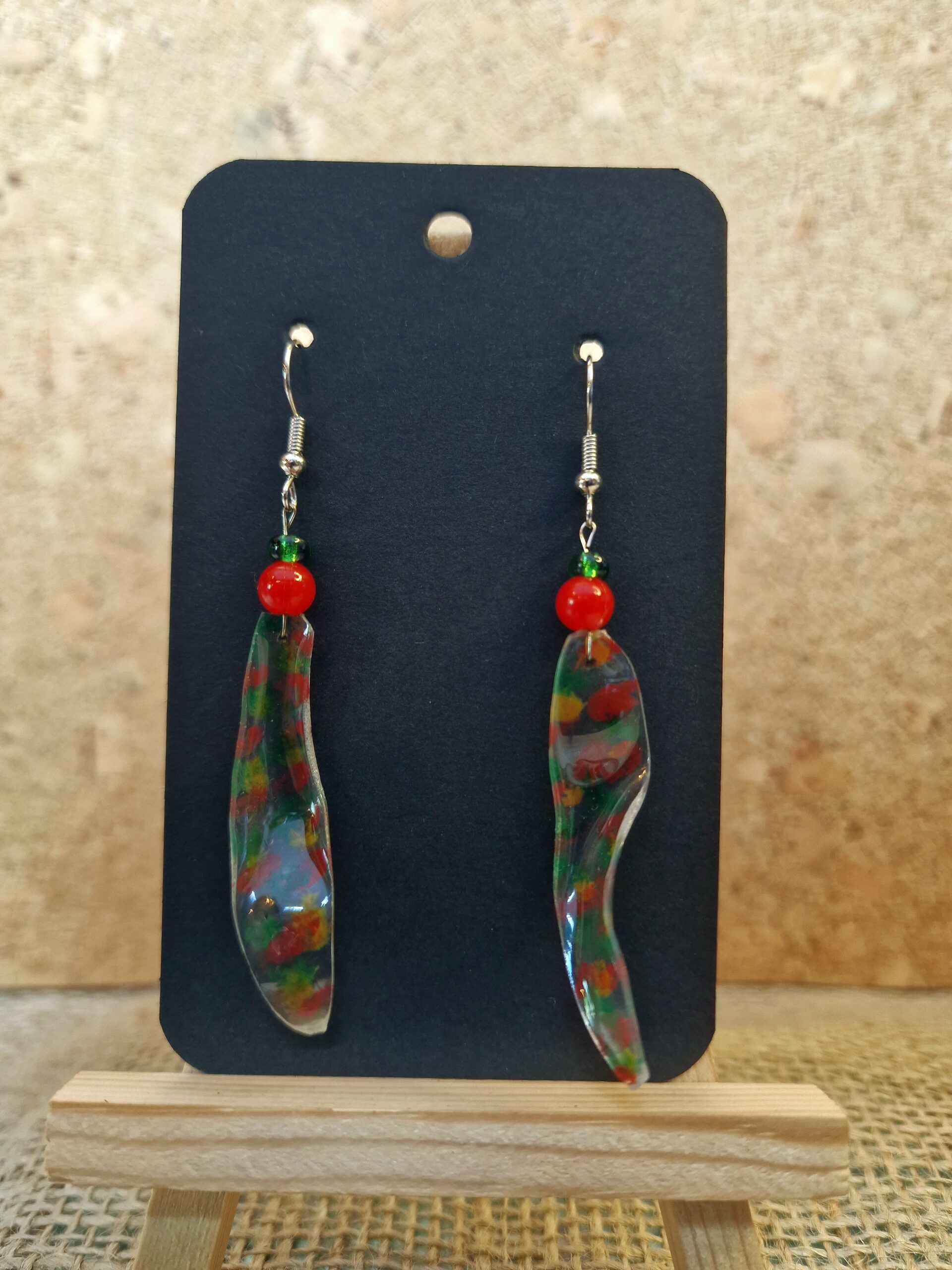 Boucles d’oreilles plastique recyclé rouge, vert & jaune (argenté – 8 cm)