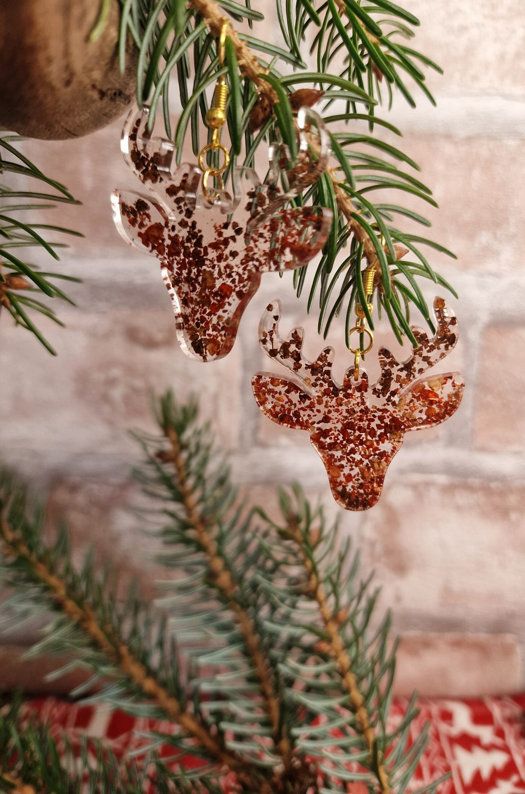Ces boucles d’oreilles artisanales en forme de tête de renne associent éclats de liège recyclé et nuances de résine rouge et brune, pour une touche chaleureuse et festive.
