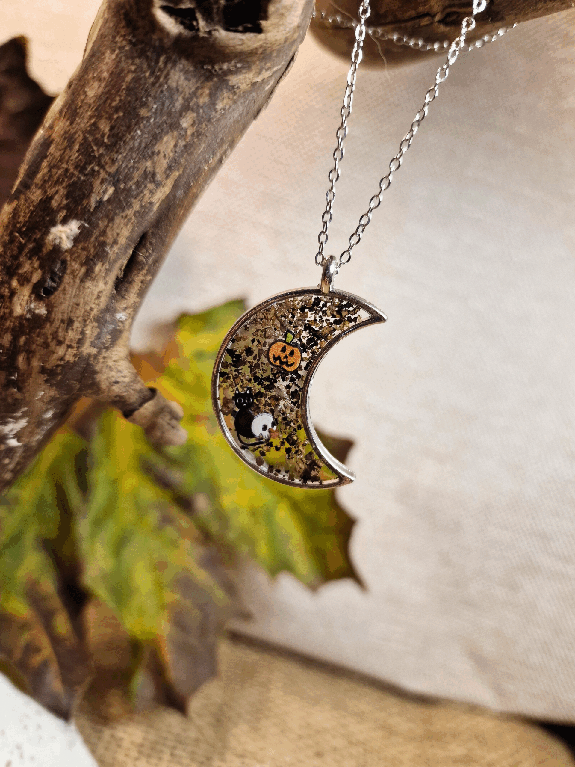 Ce collier artisanal signé Cé’rénité marie la poésie du motif lune à une touche espiègle inspirée d’Halloween. Réalisé en résine transparente et liège recyclé noir et rouge, il renferme une citrouille orange et un petit chat noir à tête de mort pour une note originale et élégante.