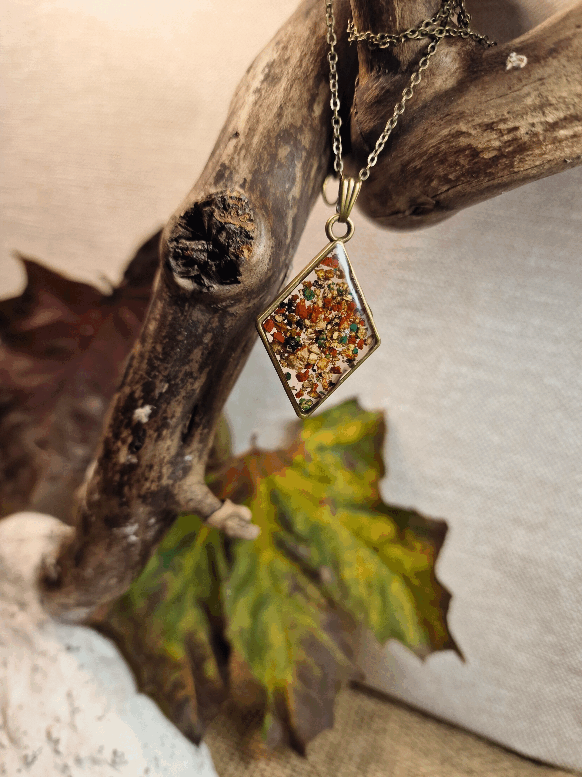 Ce collier artisanal signé Cé’rénité met en valeur un pendentif losange bronze orné d’incrustations de liège naturel et d’éclats rouges et verts dans une résine transparente. Sa chaîne fine assortie ajoute une touche vintage et chaleureuse, pour un style élégant et durable.