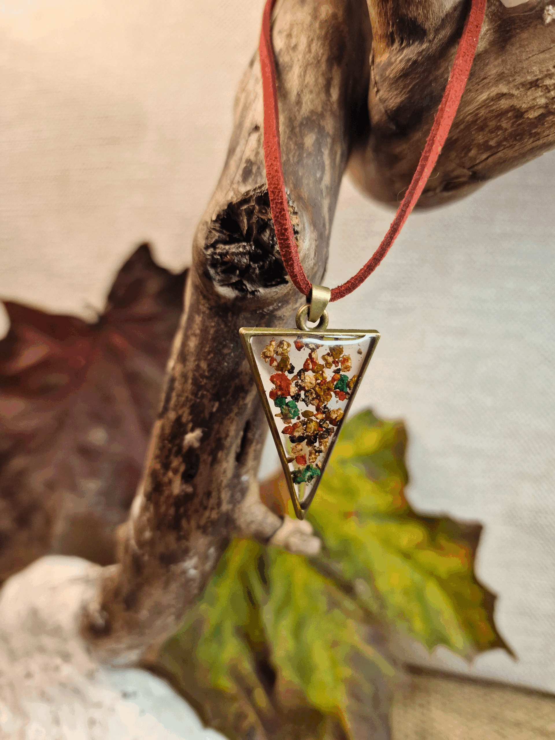 Collier pendentif triangle résine & liège rouge/vert (bronze – cordon simili rouge)