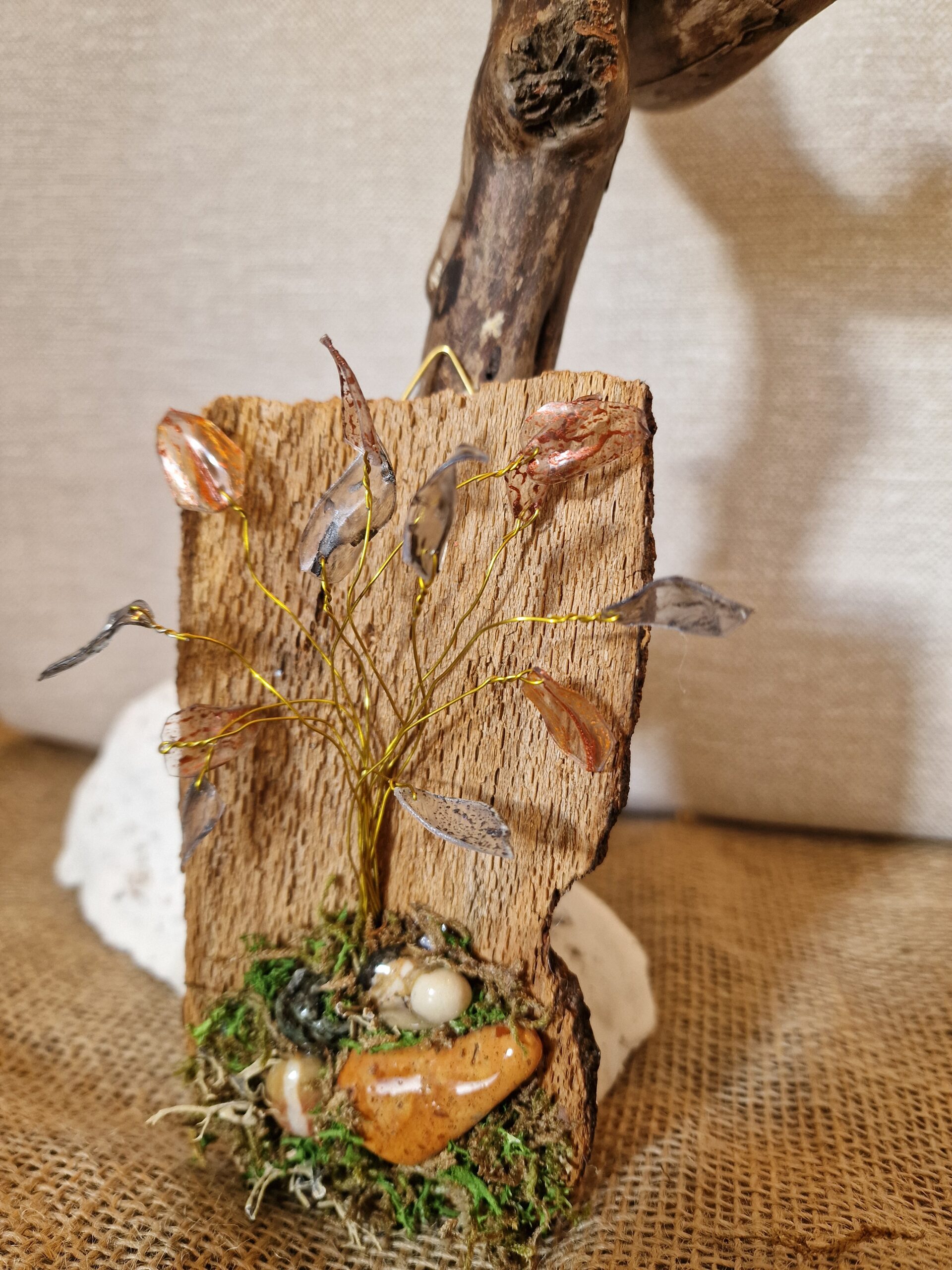 Matières : bois naturel, plastique recyclé, fil doré, mousse, pierres décoratives