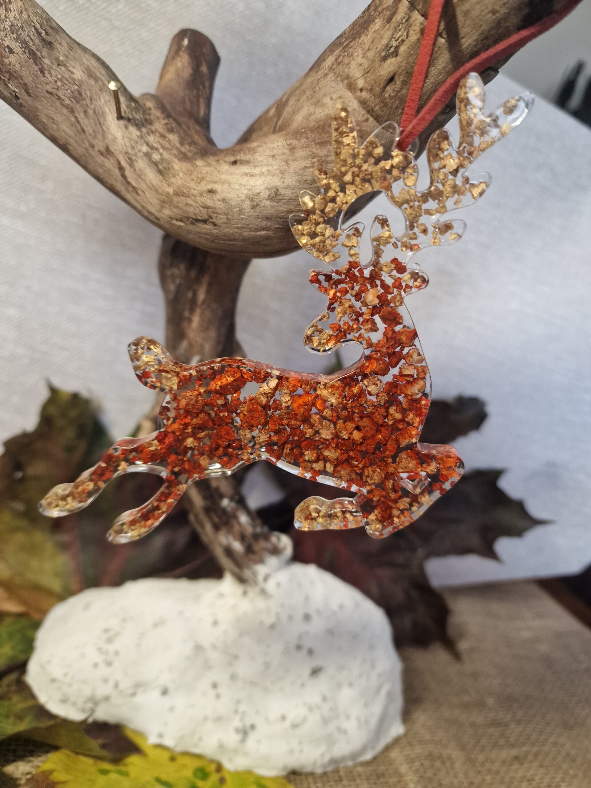 Cette création signée Cé’rénité capture la magie des fêtes avec ses nuances rouges, cuivrées et dorées. Façonnée à la main en résine transparente et éclats de liège recyclé, elle représente un petit renne lumineux et poétique à suspendre au mur, à une poignée ou au sapin.