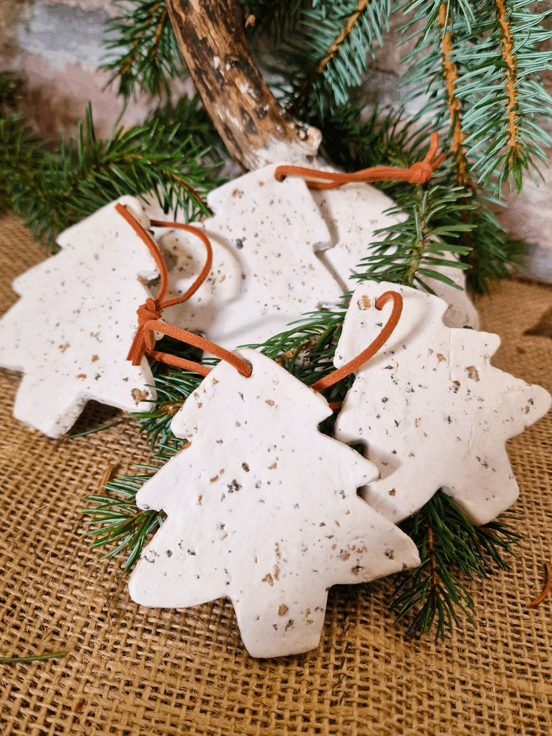 Ces suspensions artisanales en forme de sapin sont façonnées en argile blanche et incrustées de liège noir et naturel, recyclé puis broyé à la main.