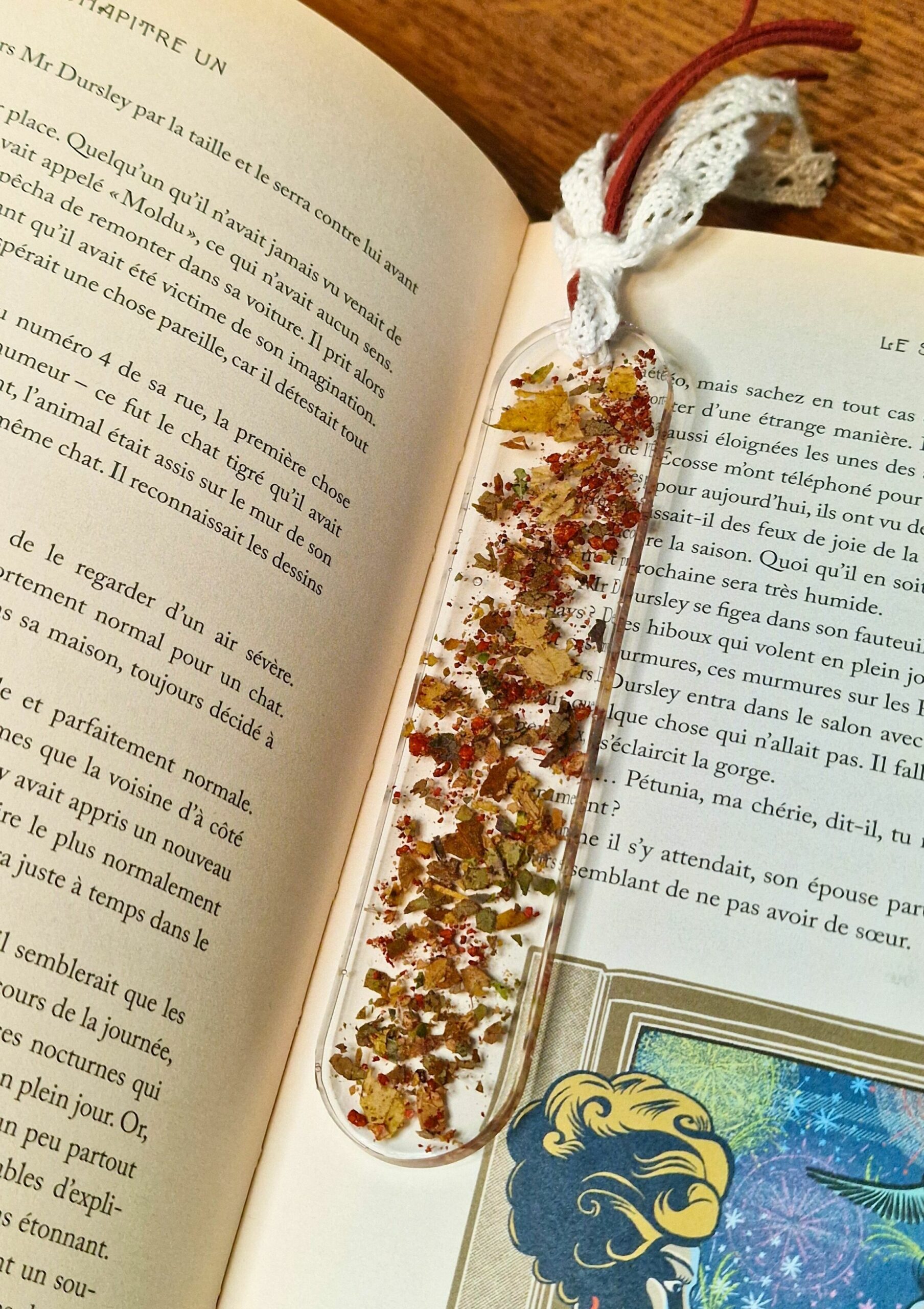 Ce marque-page signé Cé’rénité est réalisé à la main à partir de résine transparente, de feuilles naturelles séchées et de liège recyclé.
