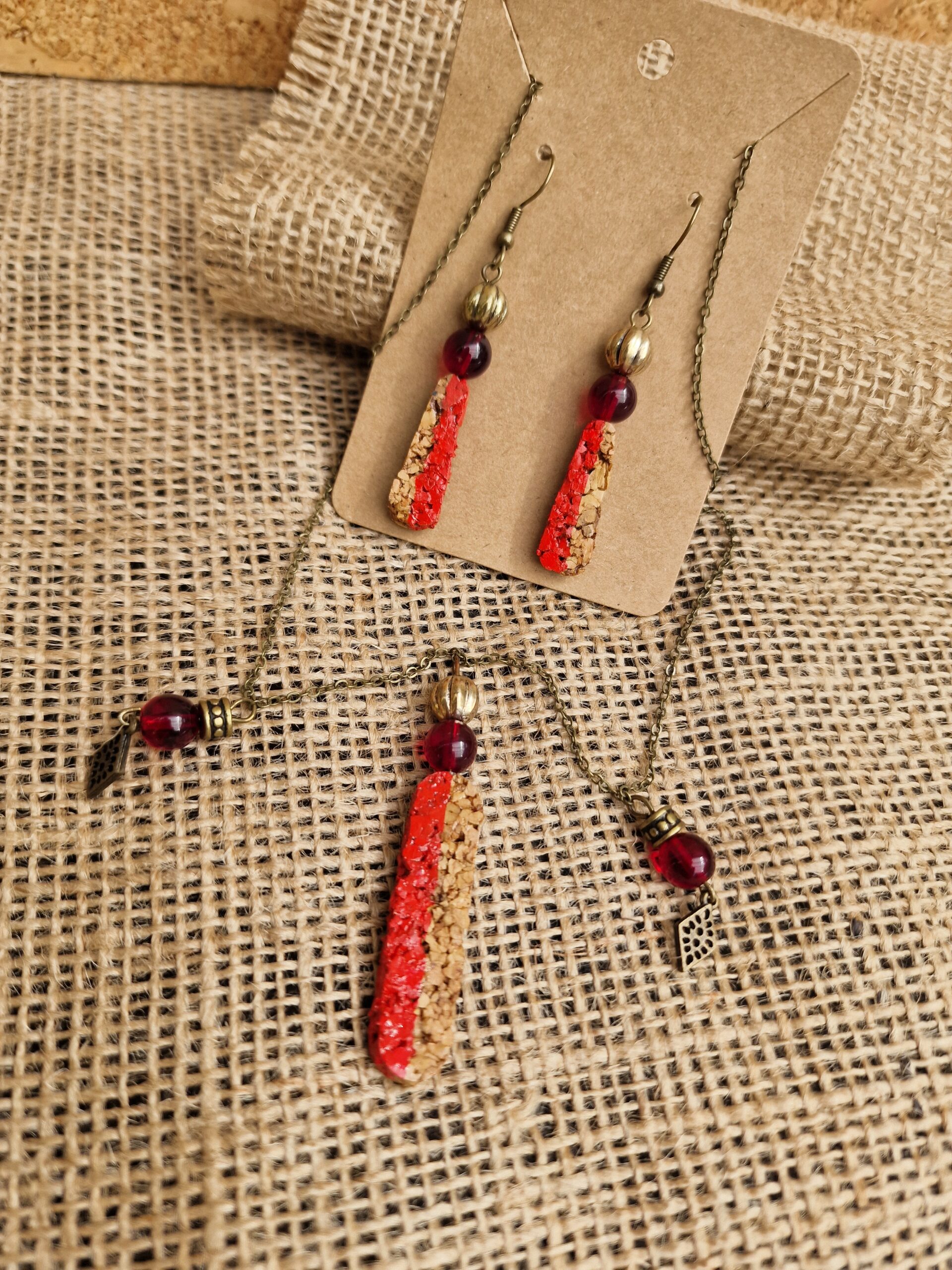 Cette parure artisanale associe la force du rouge à la douceur du liège naturel.
