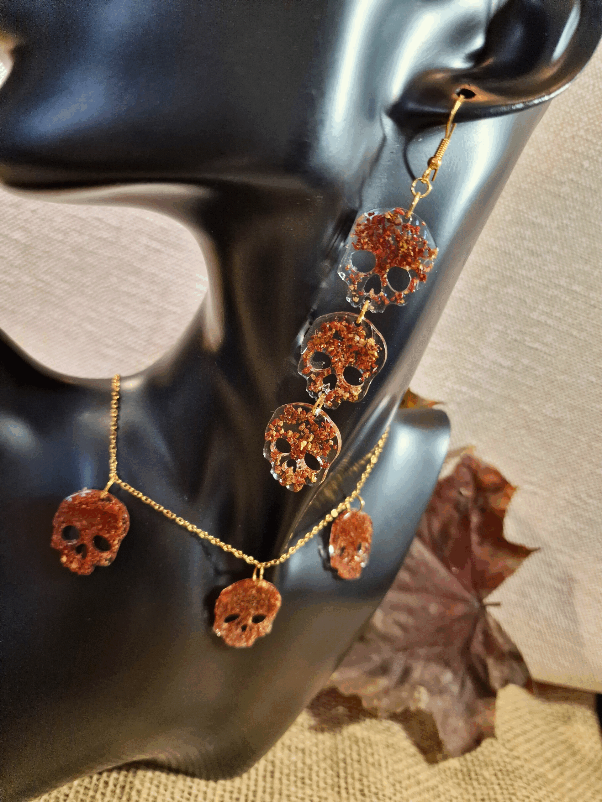 Cette parure artisanale signée Cé’rénité associe le caractère du motif tête de mort à la chaleur des teintes rouge et doré. Réalisée à la main en résine transparente et liège recyclé, elle capte la lumière pour un rendu unique et lumineux.