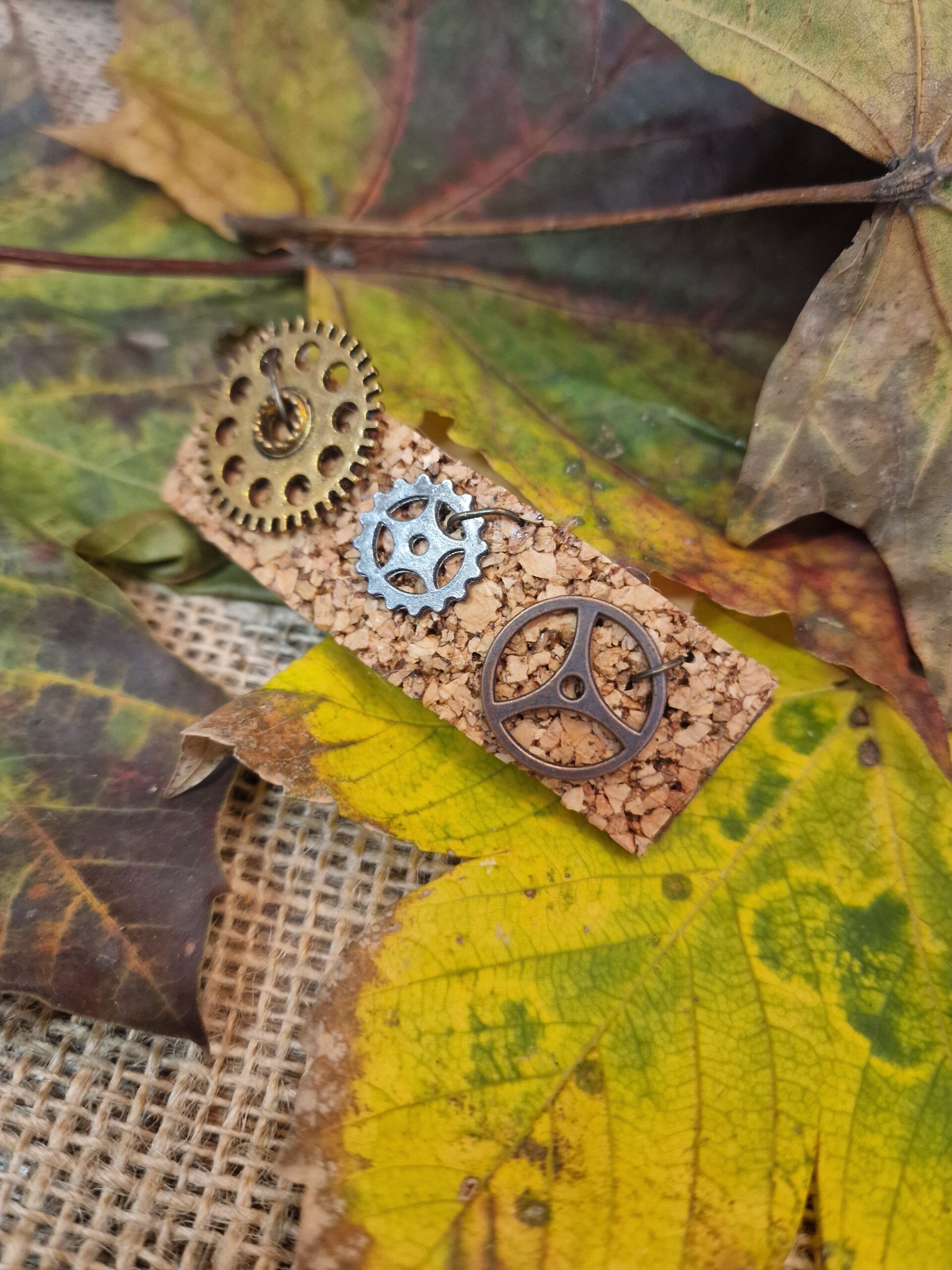 Cette pince à cheveux artisanale signée Cé’rénité est réalisée à la main à partir de liège naturel et de décorations métalliques en forme d’engrenages. Dans des tons dorés, bronze et noirs, elle mêle style rétro et élégance naturelle pour un accessoire à la fois original et raffiné.