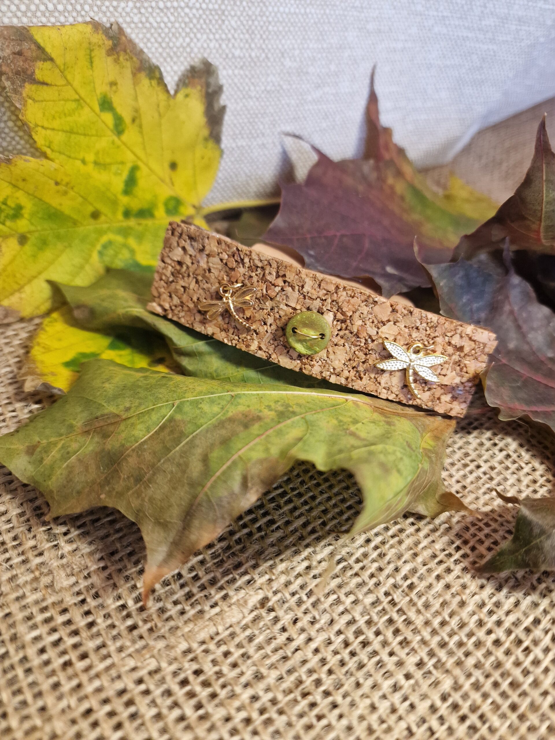 Cette pince à cheveux artisanale signée Cé’rénité est réalisée à la main en liège naturel. Ornée d’un bouton vert central et de deux libellules dorées, elle allie simplicité et élégance pour sublimer toutes les coiffures avec une touche naturelle et raffinée.