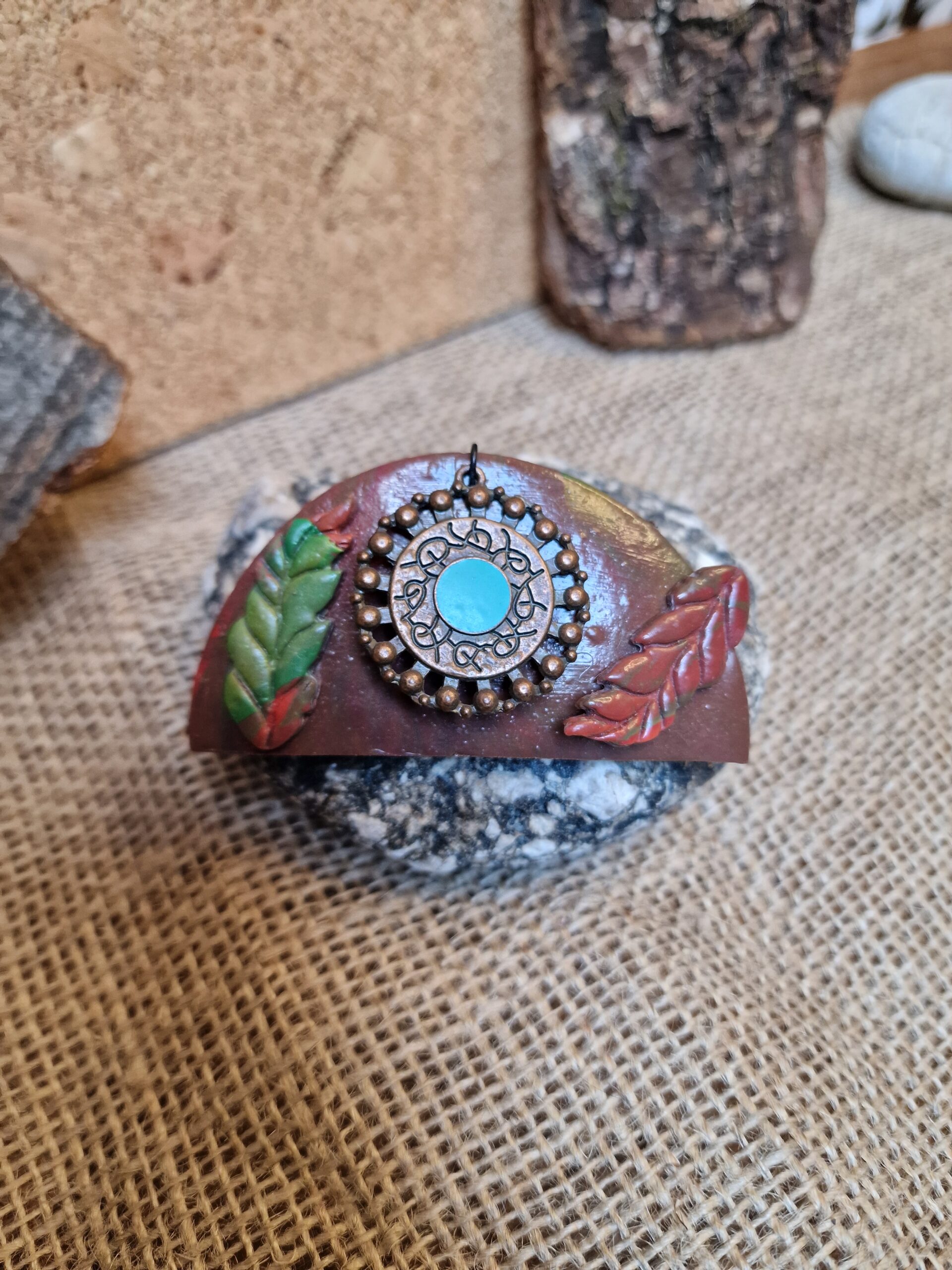 Cette pince à cheveux artisanale signée Cé’rénité associe la finesse de l’argenté à la douceur d’un médaillon turquoise central, entouré de feuilles sculptées et colorées à la main. Réalisée en pâte polymère et éléments métalliques recyclés, elle allie originalité et élégance pour sublimer les coiffures du quotidien.