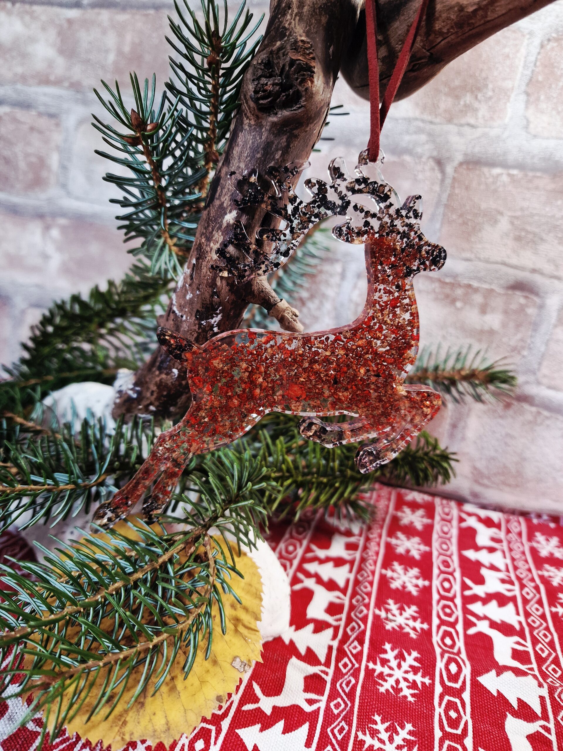 Cette création signée Cé’rénité capture la magie des fêtes avec ses nuances rouges et noires rehaussées d’éclats dorés. Façonnée à la main en résine transparente et liège recyclé, elle représente un petit renne poétique et lumineux à suspendre au mur, à une poignée ou au sapin.